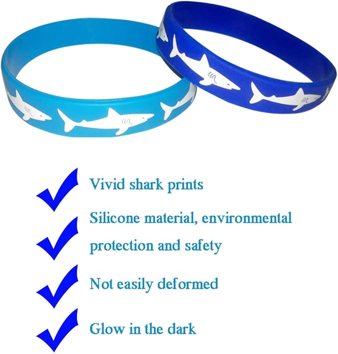 - DEEP SEA COLORS - 12 Each of Sea Green and Ocean Blue Bands with SHARKS SILHOUETTES Seen in the Waters! It has luminous function, it is suitable for day and night shark birthday party decorations