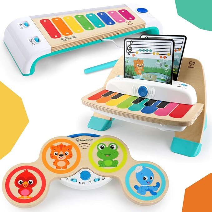 • Wooden toy with Magic Touch technology plays real instrument sounds with just a touch