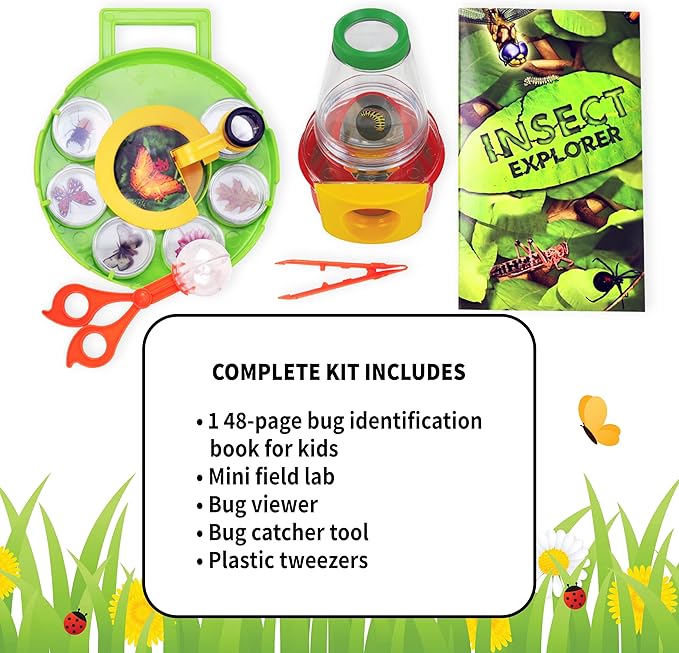 - COMPLETE BUG KIT FOR KIDS INCLUDES - Bug collection kit for kids includes 1 48-page bug identification book for kids, mini field lab, bug viewer, bug catcher tool, plastic tweezers.