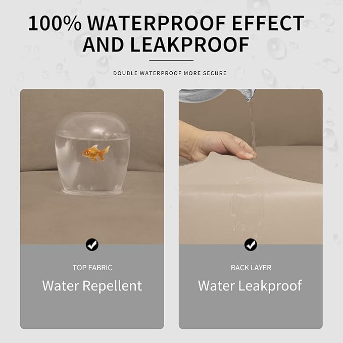 - 100% Waterproof Fabric: Top Fabric is processed with waterproof treatment, and back coated with waterproof layer. Dual waterproof feature can guarantee 100% waterproof effect and leakproof. elastane +polyester, back coated with TPU film. The couch cover is a great choice for homes with children and pets.