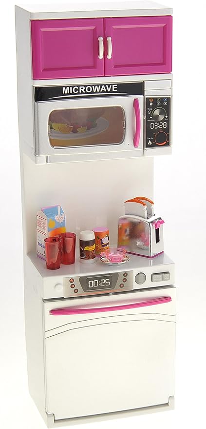 Doll Kitchen Playset, Mini Modern Kitchen Toys Pretend Play Furnitures Toy Sets Accessories Set with Realistic Light & Sound for Kids Toddlers Girls (3-in-1)