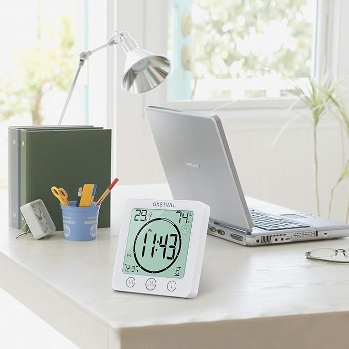 - 【Waterproof for Water Spray】Level IP24 waterproof and dustproof. Can withstand the spray from any direction(Do not put clock in water). Perfect for use in the showers, bathrooms, washroom, kitchen or next to the sink. Avoid placing clock timer directly in front of heavy water spray due to its touch screen sensitivity this may cause to activate or deactivate clock timer alarm. ★Please remove the protective film before use. ★