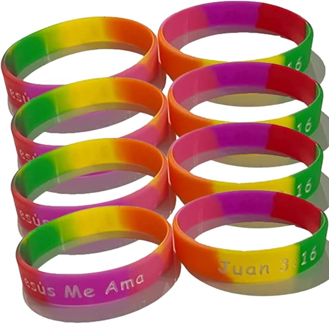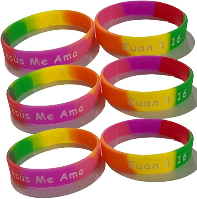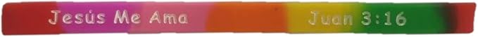 - 100-count pack of Jesus loves me, Jesus Me Ama, Juan 3:16 Christian silicone rubber bracelets. Christian silicone rubber bracelets are great for mission trips and gifts for the Spanish.