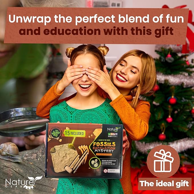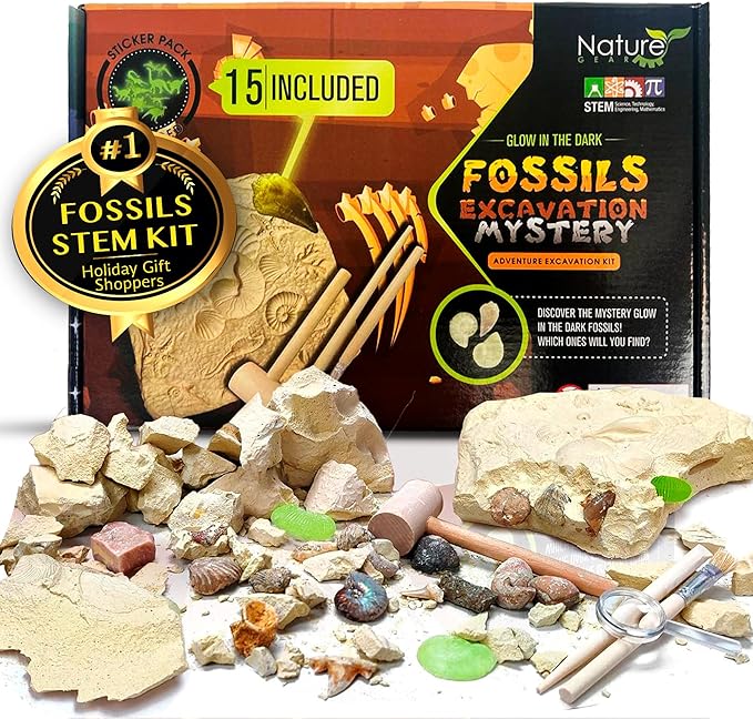 Nature Gear Dino Fossil Dig Kit for Kids, Educational Excavation Kit with 15 Glow in The Dark Mystery Fossils, Interactive Dinosaur Science Kits for Kids Age 3-5 and Up, Excavation Adventure Kit