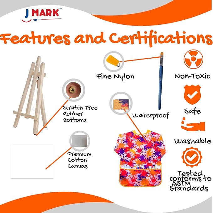 - Enhance Creativity and Motor Skills – JMark art supplies for kids paint set provides an exciting activity to improve motor skills, explore creativity, express emotions and enhance artistic skills; Boost self-confidence with our kids canvas paint sets by displaying your child’s masterpiece when completed; Our paint kit for kids also provides the ideal family, school or camp activity to be used by parents, kids teachers and everyone who loves to have painting fun using our painting easel for kids