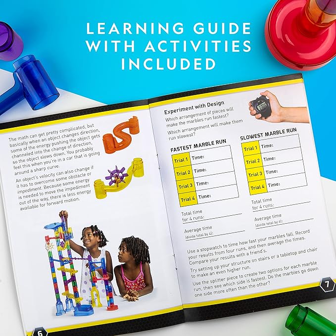 - GREAT STEM TOY - The learning guide inside teaches about the physics of motion and gravity. It also includes marble run construction experiments