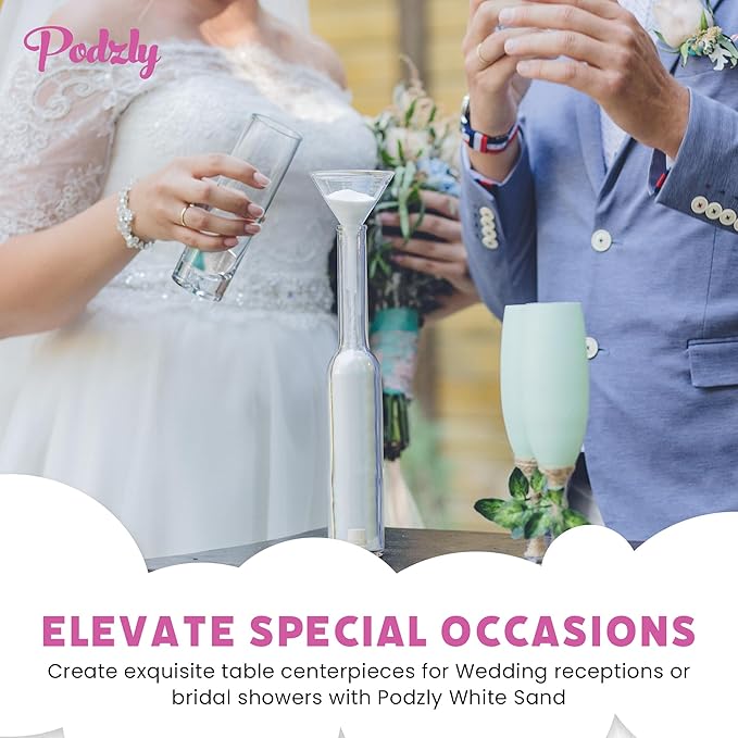 - PREMIUM WHITE SAND: Elevate your décor with Podzly's stylish and versatile decorative white craft sand. Made from fine grain high-quality sand, this toxin-free and odorless sand adds a touch of elegance to any project. Not as stark white as sugar or salt, it's the perfect choice for vases, ensuring a clump-free experience even when submerged in water.