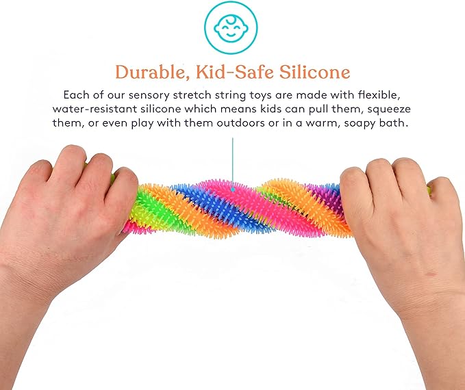 - Durable, Kid-Safe Silicone – Each of our sensory stretch string toys are made with flexible, water-resistant silicone which means kids can pull them, squeeze them, or even play with them outdoors or in a warm, soapy bath.