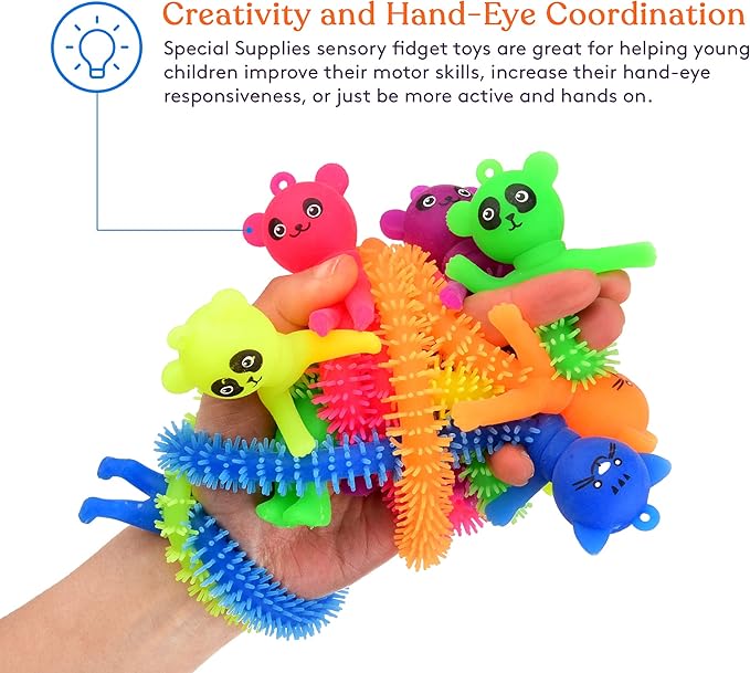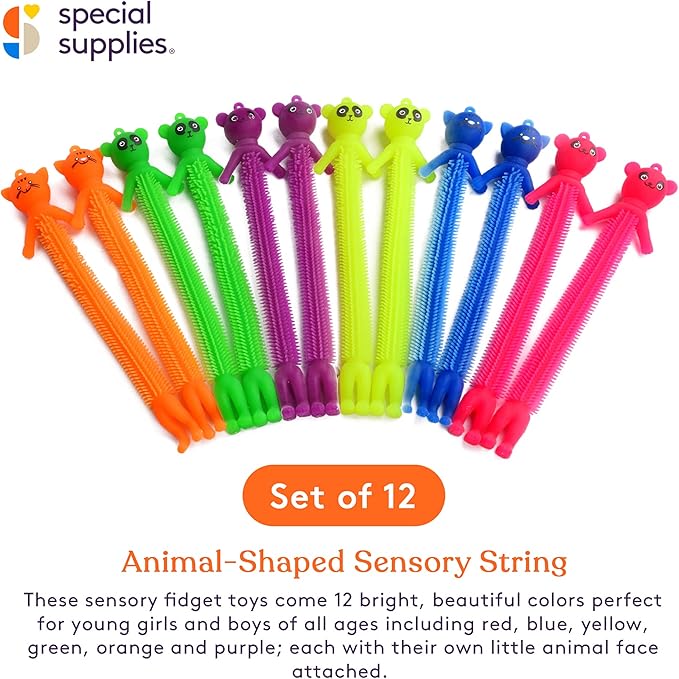 Special Supplies Kid’s Sensory Toys Fidget Strings with Cute Animal Faces, Set of 12, Tactile Stimulation for Hand-Eye Coordination, Textured Stretchy Silicone, Fun for Girls and Boys