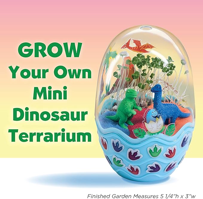 - DINOSAUR CRAFT: Decorate, plant, and grow your own mini terrarium kit for kids in a dinosaur egg-shaped environment. This craft for boys ages 6-8 is a fun and engaging toy! Use the quick-grow seeds and fun Jurassic-themed decorations to bring your dinosaur kids toy to life (Dinosaur Garden measures 5.25” h x 3” w.)
