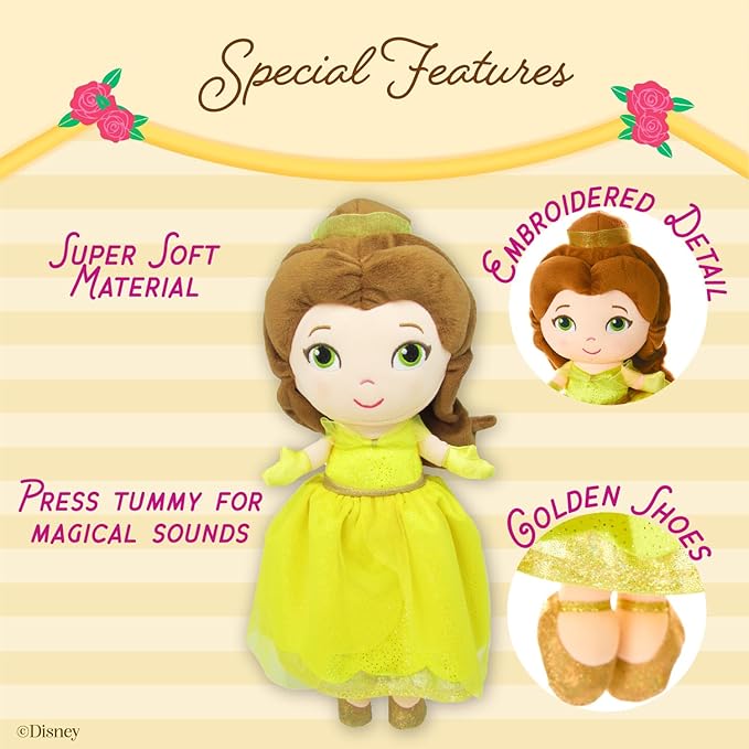 - BELLE STUFFED PLUSH: Kids Preferred presents this super soft, cute, charmingly detailed stuffed doll that makes magical sounds. Babies, toddlers, and kids love this classic & collectible comfy friend.