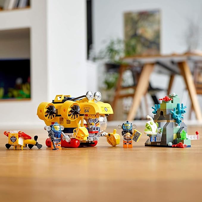- Building Kit includes a toy submarine, underwater drone and a coral-covered seabed setting, plus 4 minifigures, including LEGO City TV's Jessica Sharpe and 2 divers with cool accessories, and a glowing anglerfish figure
