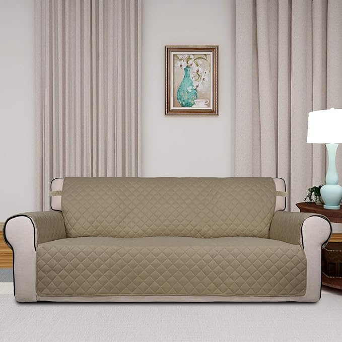 PureFit Reversible Quilted Sofa Cover, Water Resistant Slipcover Furniture Protector, Washable Couch Cover with Non Slip and Elastic Straps for Kids, Pets (Oversized Sofa, Beige/Beige)
