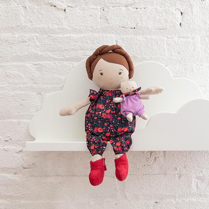 - 14 INCH SOFT DOLL: Playdate Friends Freddie measures 14 inches from head to toe, with fully embroidered facial features and sculpted, embroidered hair. Both the floral print dress and the red shoes are removable and interchangeable.