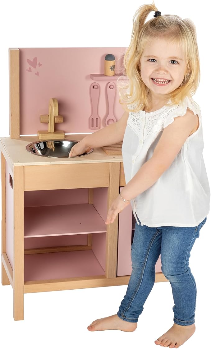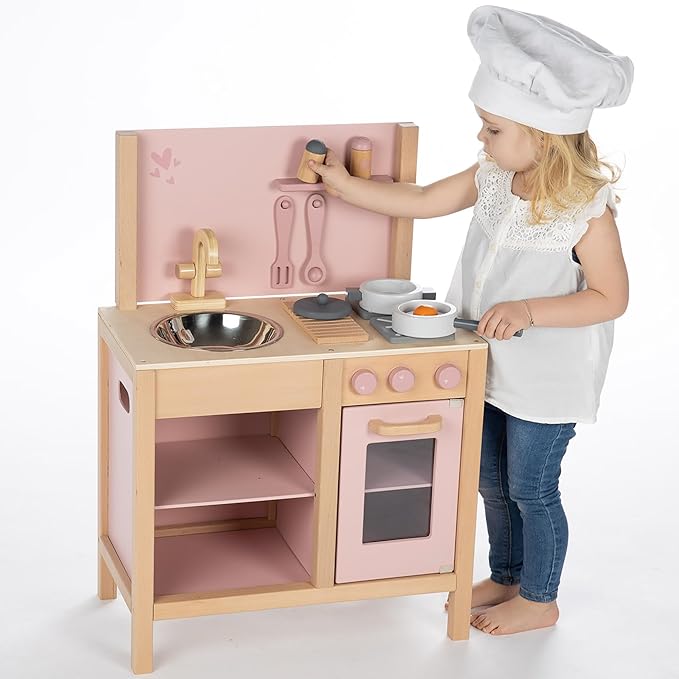Wooden Kitchen Play Set - Pink - Standing Appliance Toy, Cooking & Food Accessories, Storage-Oven-Sink, Pretend Play Station, Kids Age 3+