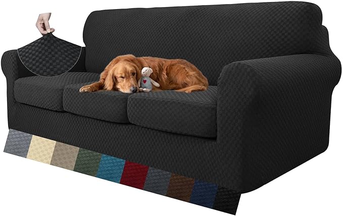 - 4 PIECES INCLUDED - MAXIJIN premium stretch sofa cover is exclusive designed for those couches with individual cushions, which includes one couch cover and three cushion covers, a Must-have magic sofa covers for 3 cushion couch! Because the seat cushions cover are separated, they will fit better, and not change the whole outlook of your couch, looks like a customized slip cover. And the strong elastic edge on bottom help secure the cover and ensure 100% NON-SLIP