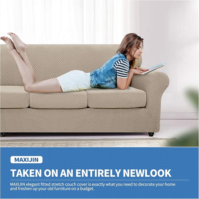 - HIGH STRETCHY - MAXIJIN fitted sofa slipcovers are made of high quality 85% polyester and 15% spandex fabric, which is soft in texture, comfortable in feeling and with good breathability. Due to its high stretchable feature, our universal couch protector cover is more flexible to be applied to various couches,such as t-cushion couches, box cushion couches, high back couches, small and extra large leather couches. Improved thick cloth is more durable and wear resistant