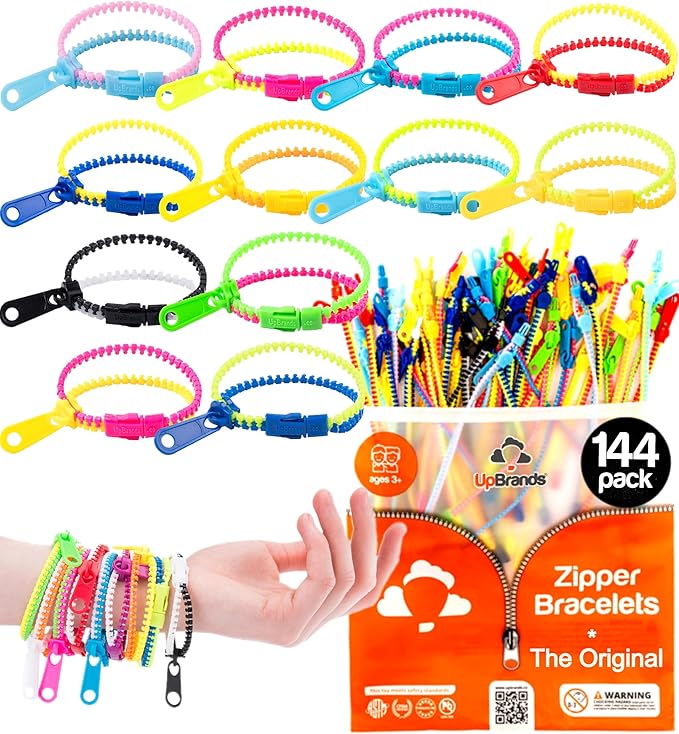 UpBrands 144 Fidget Toys Party Favors for Kids, Friendship Zipper Bracelets 7 ½ “ Sensory Bulk Set Neon Colors, Kit for Valentines, Birthday, Goodie Bags, Easter Egg Basket Stuffers, Pinata Filler