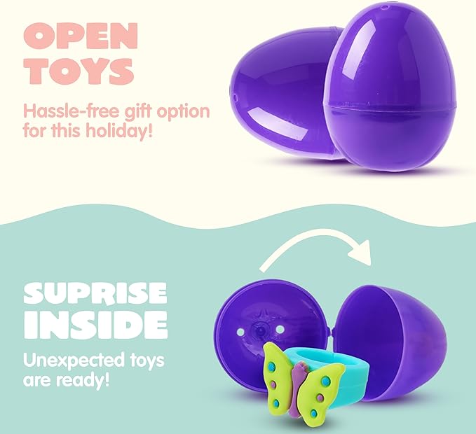 - SUPER VALUE PACK. Toy Prefilled Easter Eggs set includes 120 egg pieces with 6 spring bright colors: blue, yellow, green, pink, violet, and orange. Each easter egg comes with assorted toys and stickers. Assorted toys include Easter Stampers, Mochi squishy toy, Easter Rubber Ring, Dinosaur, Gyro, Slap Bracelets, Sticky toys, Rabbit Eraser, Mermaid Bracelet, Unicorn Bracelet, and Pull Back Car, etc.