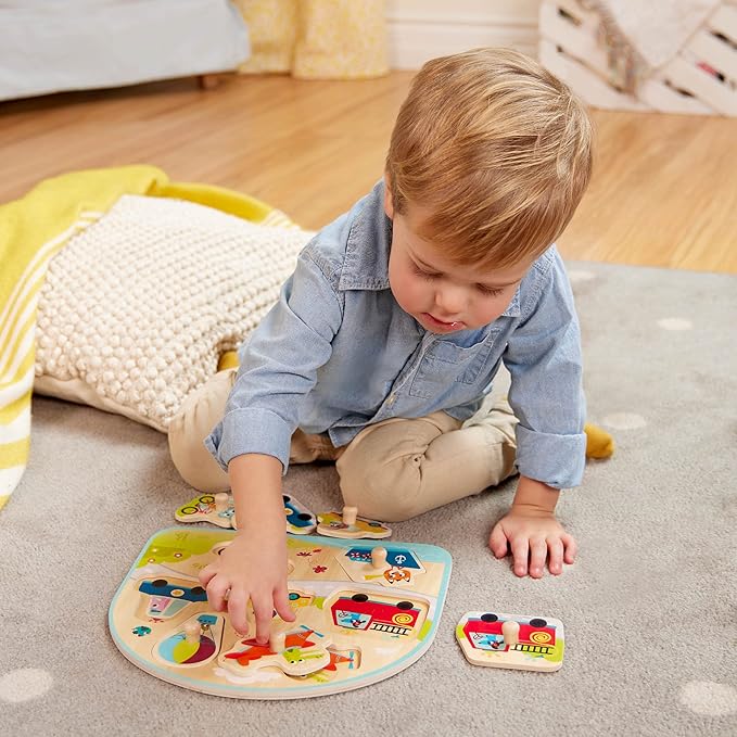 • PEG PUZZLE: Learn about different vehicles, animals, and professions with a wooden peg puzzle!