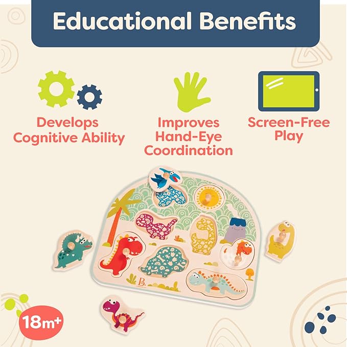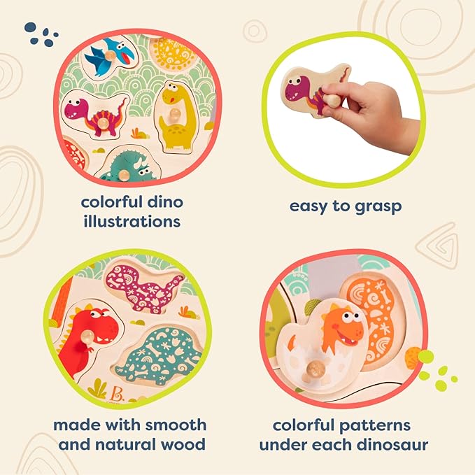 B. toys- Stomping Dinos- Wooden Peg Puzzle – Dinosaur Puzzle – 8 Pieces – Classic Toys for Toddlers, Kids – 18 Months +