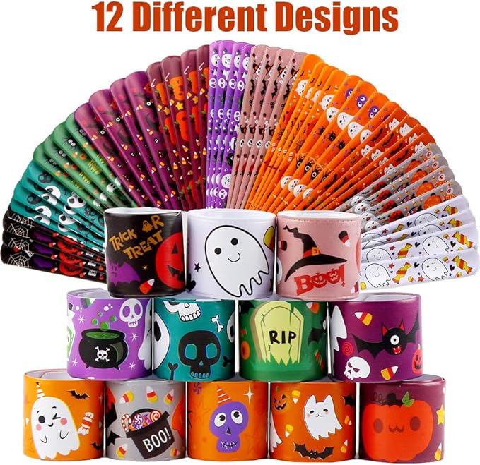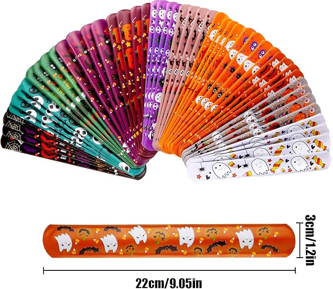 - Halloween Slap Bracelets Bulk: 48Pcs Halloween snap bracelets in 12 different styles, skull, pumpkin, ghost, bat, cat, hat, many kinds of pattern, provide more choices for you