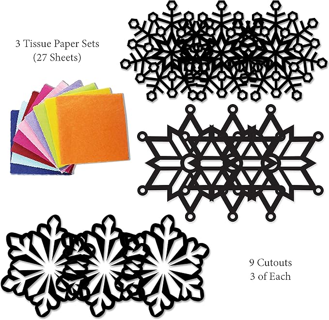 - [SUNCATCHER CRAFT – SNOWFLAKE] Includes 3 Sets of 3 Precut Snowflake Templates and 3 Sets of 9 Assorted Color Tissue Papers.