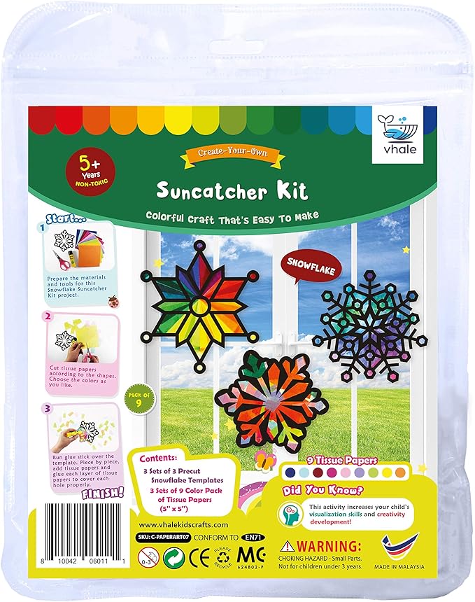 - [FEATURES] This easy and simple create your own kit contains everything needed to design and make Snowflake themed suncatchers. With Snowflake precut templates and plenty of colorful tissue paper, this suncatcher kit is guaranteed to brighten your day.