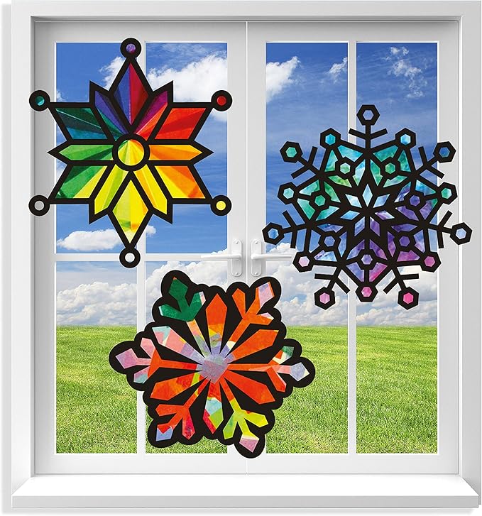VHALE Suncatchers Craft 3 Sets (9 Cutouts) w Tissue Papers Stained Glass Effect Paper Sun Catcher Kit, Window Art, Classroom Crafts, Creative Art Projects, Kids Party Favors (Snowflake)