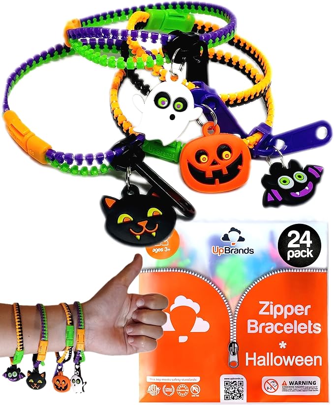 • UpBrands Halloween Zipper Bracelets – 24 Pack: These fun and colorful zipper bracelets are perfect for adding excitement to Halloween goodie bags and non-candy trick-or-treat toys. UpBrands' bracelets are adored by children and create a thrilling sensory experience, making any party or celebration a hit!