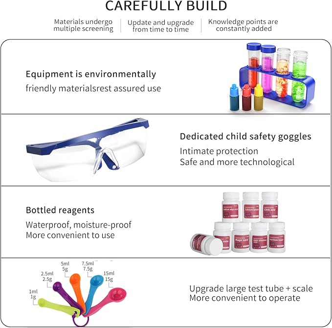 - Explore 30+ Scientific Experiments - Rich and interesting science laboratory kits, let children become a scientist, create rainbow rain, erupt volcanoes, rainbow fountains, bottle blowing balloons etc., discover the mystery of science.