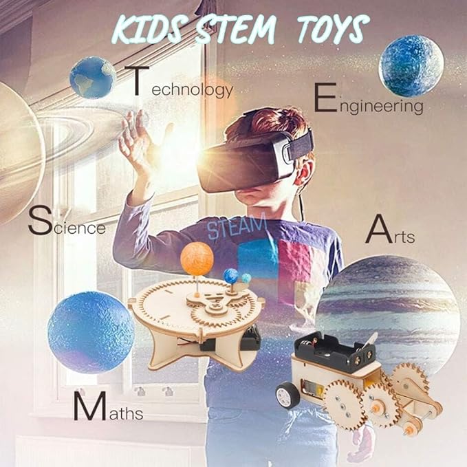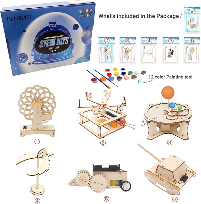 - 6 in 1 STEM Kits for Kids: Contain 6 different model kits, Electric Gear Car, Sun-Earth-Moon Model, Balance Bird, Wooden Tank, Carousel Model and Magic Window