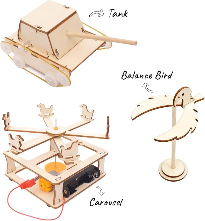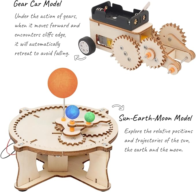 - 6 in 1 STEM Kits for Kids: Contain 6 different model kits, Electric Gear Car, Sun-Earth-Moon Model, Balance Bird, Wooden Tank, Carousel Model and Magic Window