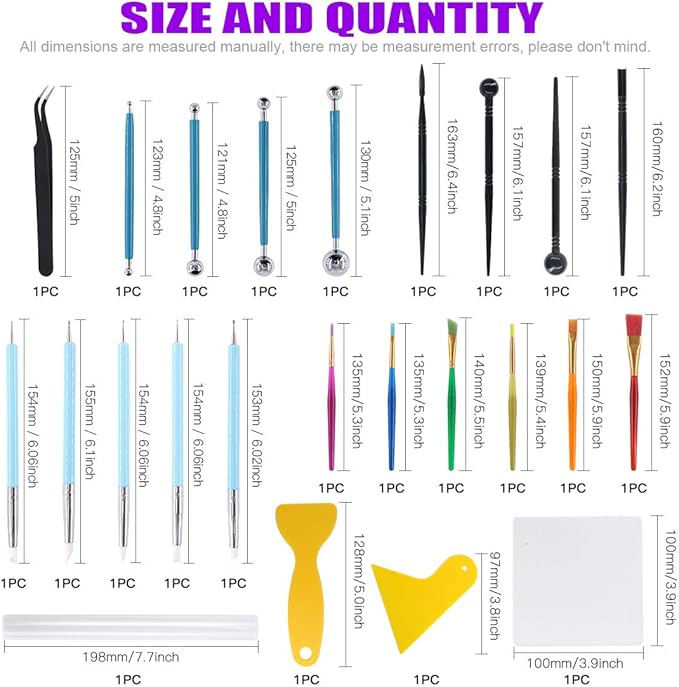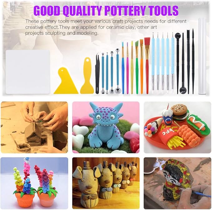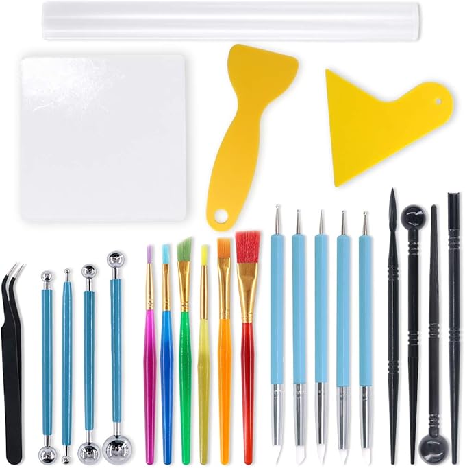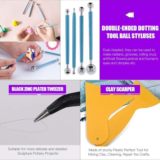 - ❤ What You Get ----- In this kit, You will get 24Pcs Modeling Clay Sculpting Tools Kits, Including 6Pcs Painting Brush, 4Pcs Ball Stylus Tool; 5Pcs Dual-ended Dotting Design Pottery Tools; 4Pcs Plastic Ball Rod Stylus Modeling Tools; 1Pcs Acrylic Backing board; 1Pcs Clay Roller; 2Pcs Clay Scarper; 1Pcs Tweezers, In total 24Pcs.