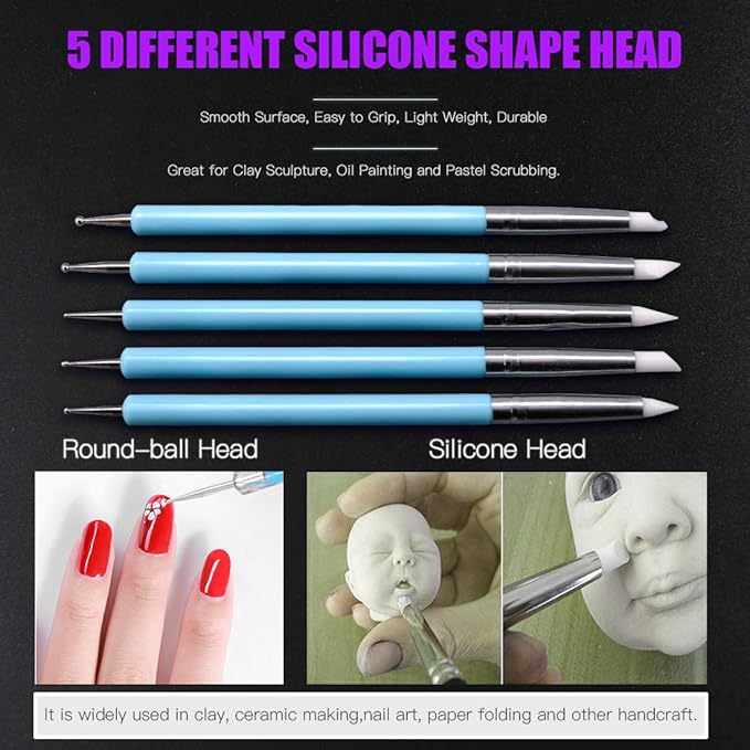- ❤ 5Pcs Dual-ended Design Pottery Tools ------- With dotting tools and rubber tip pens, ideal for making dots, blending seams in clay, painting on rocks and making paper flowers;Angle chisel, flat chisel, cup chisel, cup round shape, ideal for color shaping, blending, drawing, fine detail, touch-up work and remove the fingerprints. More convenient to use and carry.