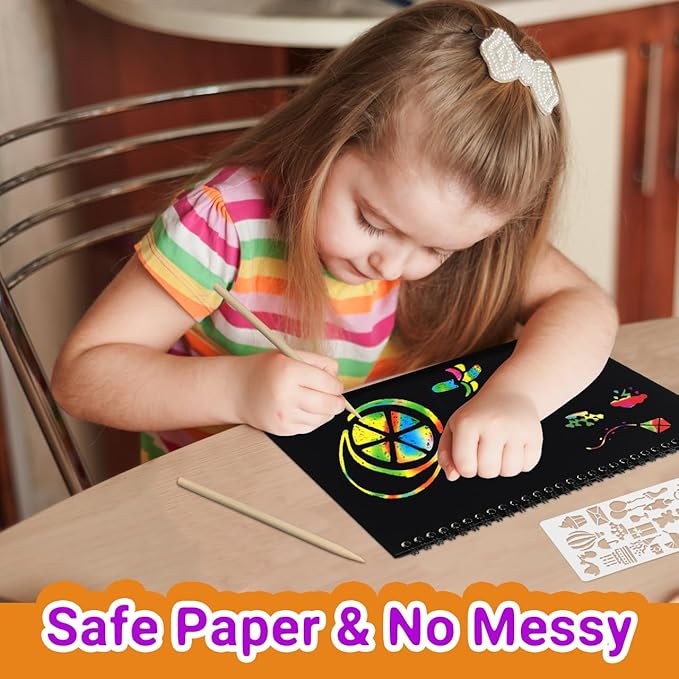 - 🌈RAINBOW SCRATCH KIT - 20 black scratch sheets, 4 wooden styluses and 4 drawing stencils and 1 gift box. The spiral bound of the scratch off notebook is easy to lay flat and flip the rainbow scratch paper, you can easily turn and collect finished arts works. Kids can use the stencils to design more cute and colorful shapes on the magic scratch paper