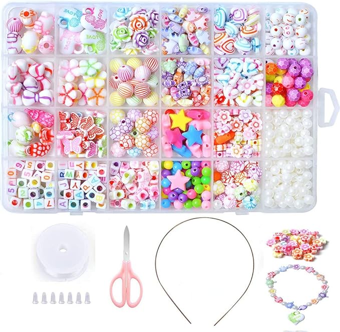 - Beads Set: This bead has different shapes, sizes and colors, plus beading tools, all stored in a transparent bead storage box. Ideal for brightly finished bead sets for children over 6 years old or DIY enthusiasts
