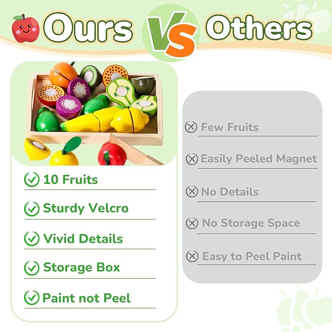 - SAFETY PREMIUM QUALITY: The wooden play food toys fruit cutting games are made of stubborn wood material with smooth surface and curves,non-odor and durable. Reusable self-stick tabs will not come off the items easily.