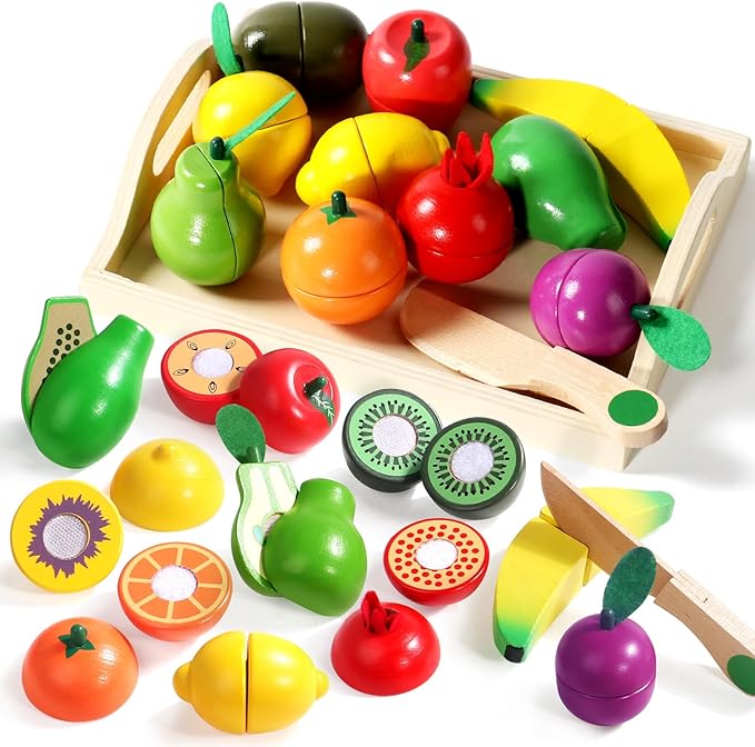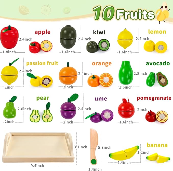- VARITY PRETEND FOOD TOY: The wooden toy includes tray, knife and different colorful fruit and vegetable groups such as apple, orange, banana, lemon, kiwi and so on. Keep your kids busy while they pretend a chef and play these toy kitchen accessories.