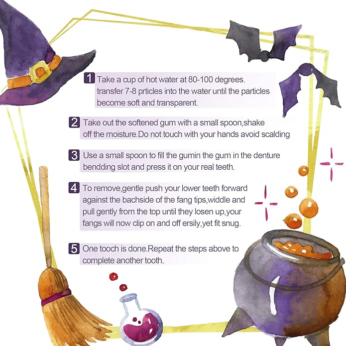 - How to use vampire teeth: firstly, soak the adhesive pellets in warm water (above 70 degree Celsius), making the color of adhesive pellets change from white to transparent; Secondly, roll the adhesive pellets into fangs and put them on vampire teeth; Finally, dry your true teeth and wait for the temperature of adhesive pellet that drop to the appropriate temperature before wearing