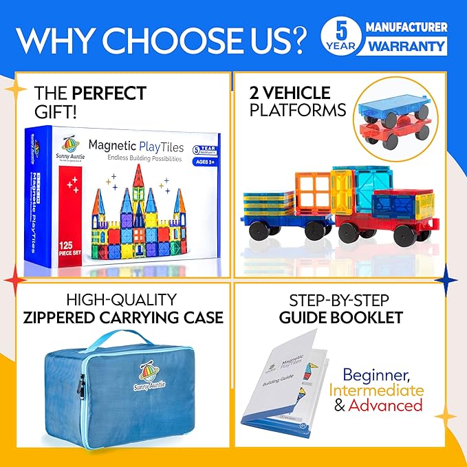 - 【THE ULTIMATE SET OF MAGNETIC TILES!】The only magnetic tiles set that comes with a full 5-year warranty! This magnetic tile set has everything that kids want. The set includes 150 magnet tiles in various shapes ,and a high-quality fabric carrying case, and a specially-designed Guide Booklet. All designs in the booklet can be built with this one set. The set also includes 2 cars, which kids always love. All pieces are in bright, vivid colors.