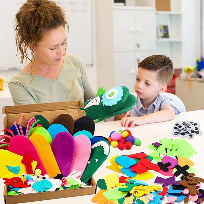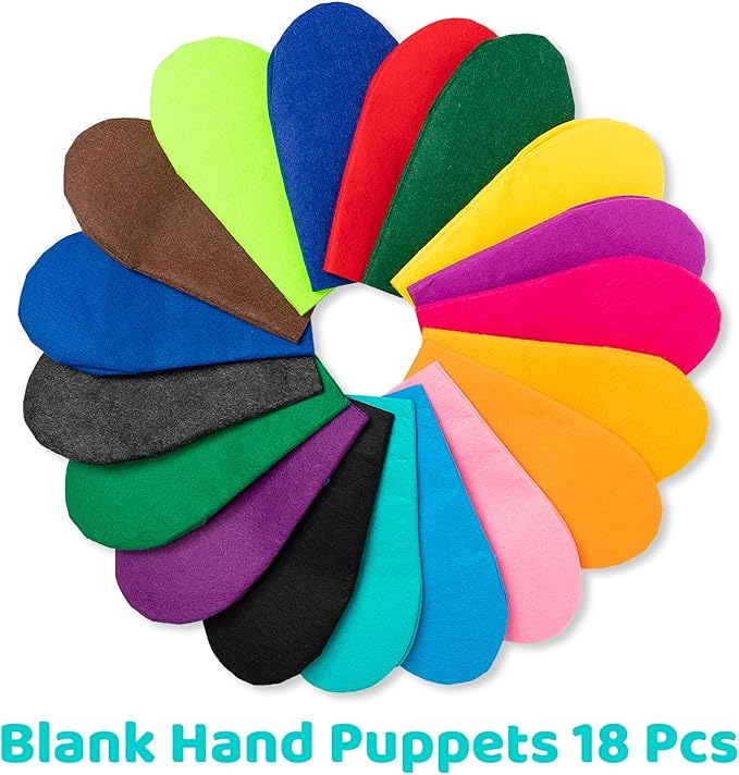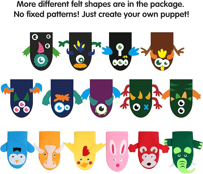 - SUPER KIT - Package comes with 18 pcs colorful hand puppets, 1 bundle pipe cleaners, 1 bundle pompoms, 1 bundle googly eyes, 1 bundle felt decors and a paper box.