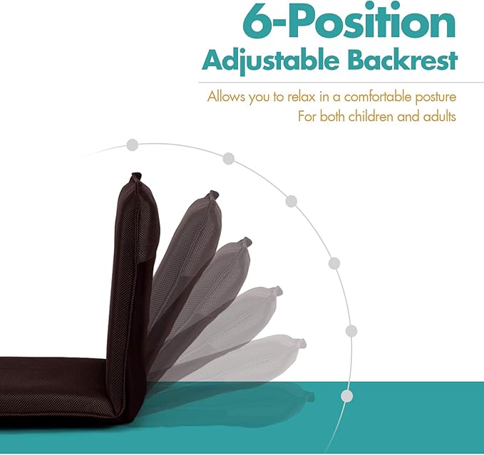 - 6-Position Adjustable Backrest—The adjustable backrest in multiple positions allows you to sit comfortably for several hours with proper posture. The straight back helps you sit upright with support. The adjustable floor chair can be laid flat, which is very suitable when your kids just want to lie down.