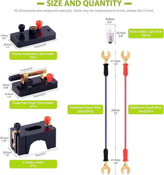• 🚥 Perfect Physics Experiment Kit --- Including 2 E10 bulb holders, 2 single pole single throw switches, 2 sets of electricity connector wires(Blue & Red), 2 series or parallel D battery holders & 10 pieces white bulb light bulbs miniature screw base. Everything have been prepared for you except battery.