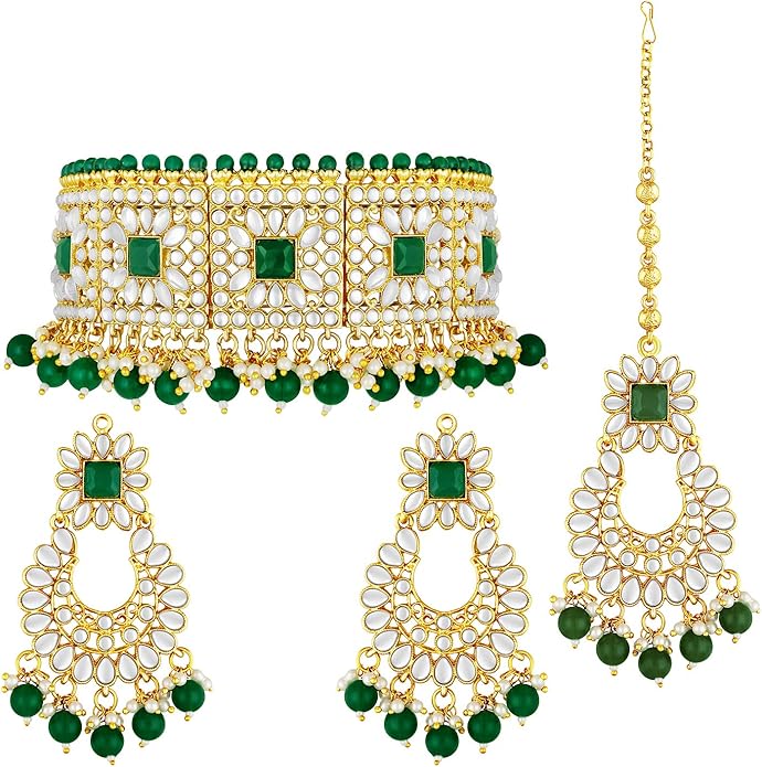 Aheli Bridal Kundan Faux Pearl Choker Necklace with Earrings Maang Tikka Gift for Women Indian Traditional Bollywood Fashion Jewelry Set