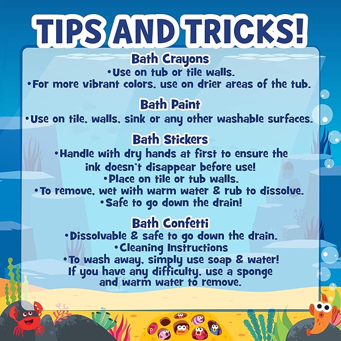 - WASHABLE BATH CRAYONS & PAINTS: Transform bath time into arts & crafts time — use the washable bath crayons and paints to create under-the-sea scenes in the tub, poster, or any of the bath clings! Try using the paint roller to spread the fin-tastic colors around and make waves!