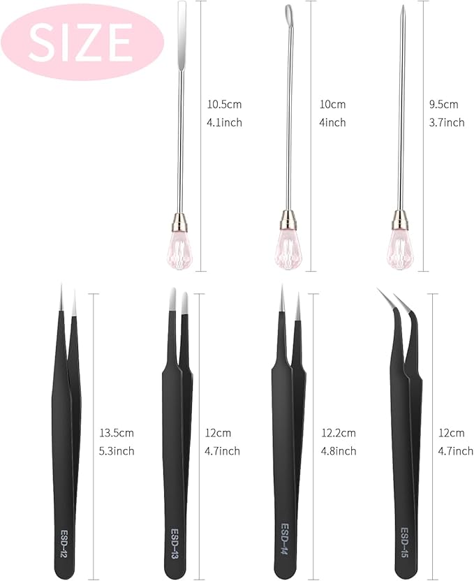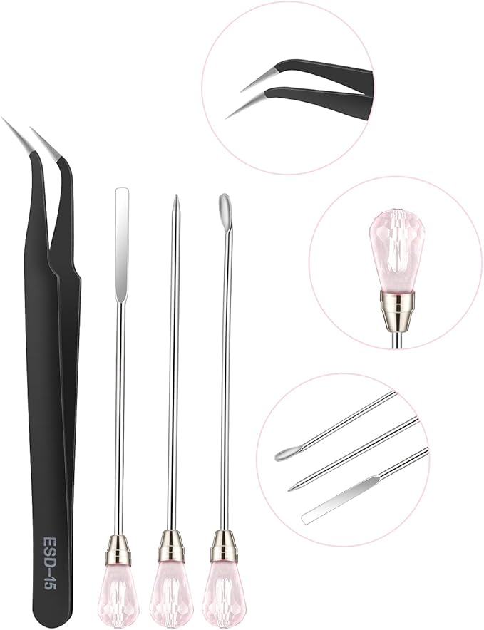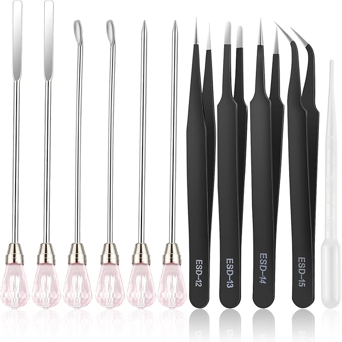- 【11 Pcs Reusable Resin Tools Set】: Our silicone tools for resin includes 2 pcs stirrers, 2 pcs glitter spoons, 2 pcs muddler poke needle, 4 pcs craft tweezers for resin and 1 pc transfer pipette. This uv resin tool is totally enough for your daily needs and use. It will be your practical assistants in DIY resin work. NOTE:If the pink gems are loose. A simple twist and they are fine.