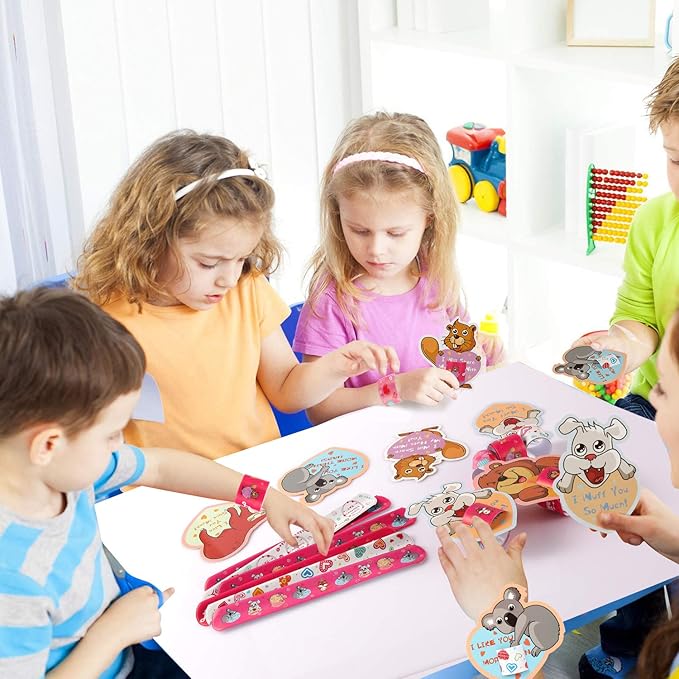 - đăPremium-Quality MaterialăOur valentine's day cards for kids classroom are on high-quality cardstock, printing with cute animal designs. And the valentines day slap bracelets are made by durable metal core inside, tightly wrapped with thick soft faux leather type PVC material outside. What's more, the edges are firmly sealed, safe and gentle for skin touch, which won't cause harm to kids' hands and wrists.