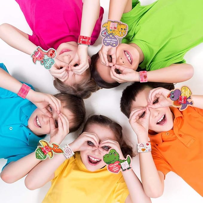 - 🎁Classic Toy and Easy to Assembly: Firstly, choose one Valentine's Card you like, write down the name on the 'From' and 'To' or and greeting words you want. Then simply insert the slap bracelet through the gift card, it will become a special gift decor or fun party supplies. Just slap it on hand, gift, or anywhere you want, it will comfortably fit grip, which is easy to use and portable.
