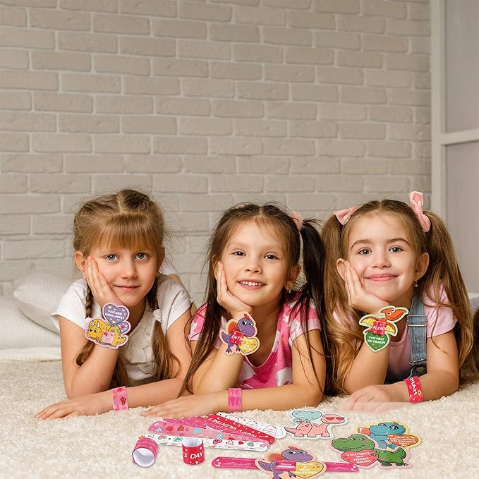 - 🎁Beautiful & Cute Kids Valentines Day Cards: This slap bracelet pack come with 30 pcs dinosaur valentines cards for kids, they are all made of quality non-toxic paper pulp, make sure it is safe for kids. 5 different super cute dinosaur patterns (6 pcs for each pattern), which can make your very own slappy Valentine’s Day Cards.